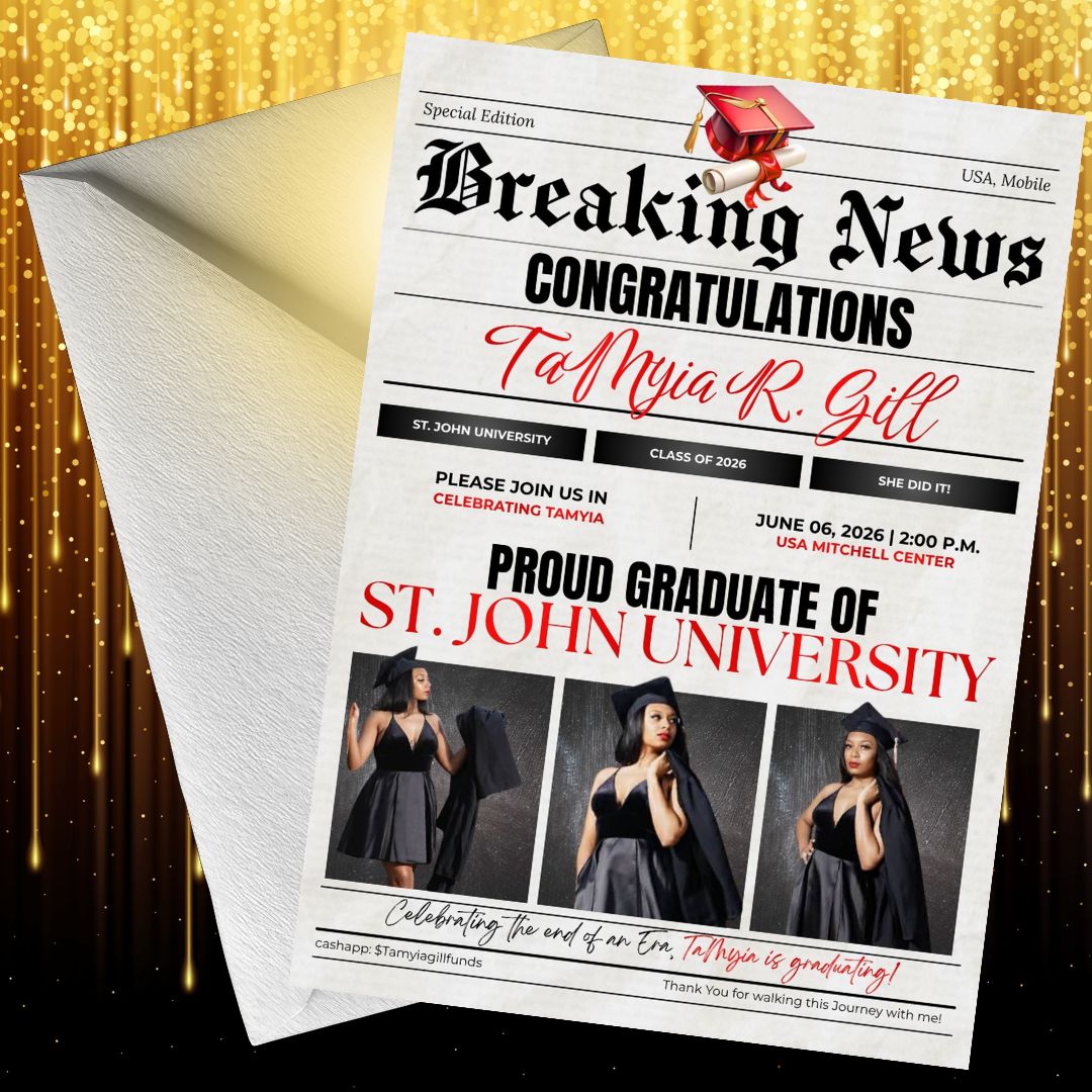 Include up to 2 photos, school colors, and personal details for graduation celebration. Invitations are printed on 5 x 7 glossy cardstock; envelopes option available.