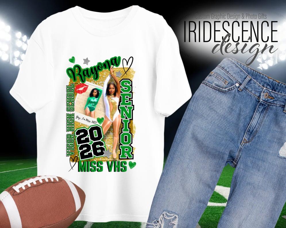 High School Senior T-shirt with graduation year, name, and title. Decorated with hearts and photo frame. Customize with your photos, name, graduation year, and title. Don't worry, the image doesn't fade, crack or peel. It is dyed into the fabric (you can't feel it on the shirt). The image is vibrant, full color, and will appear as it is sent.