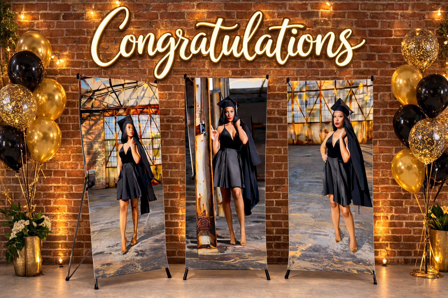 First, you'll receive three (3) 2x6ft custom banners printed on high-quality 13oz vinyl. These banners feature a unique design celebrating the graduate, with their name, photo, and graduation year proudly displayed. We'll also provide three (3) sturdy X stands, so you can easily set up the banners indoors or outdoors.