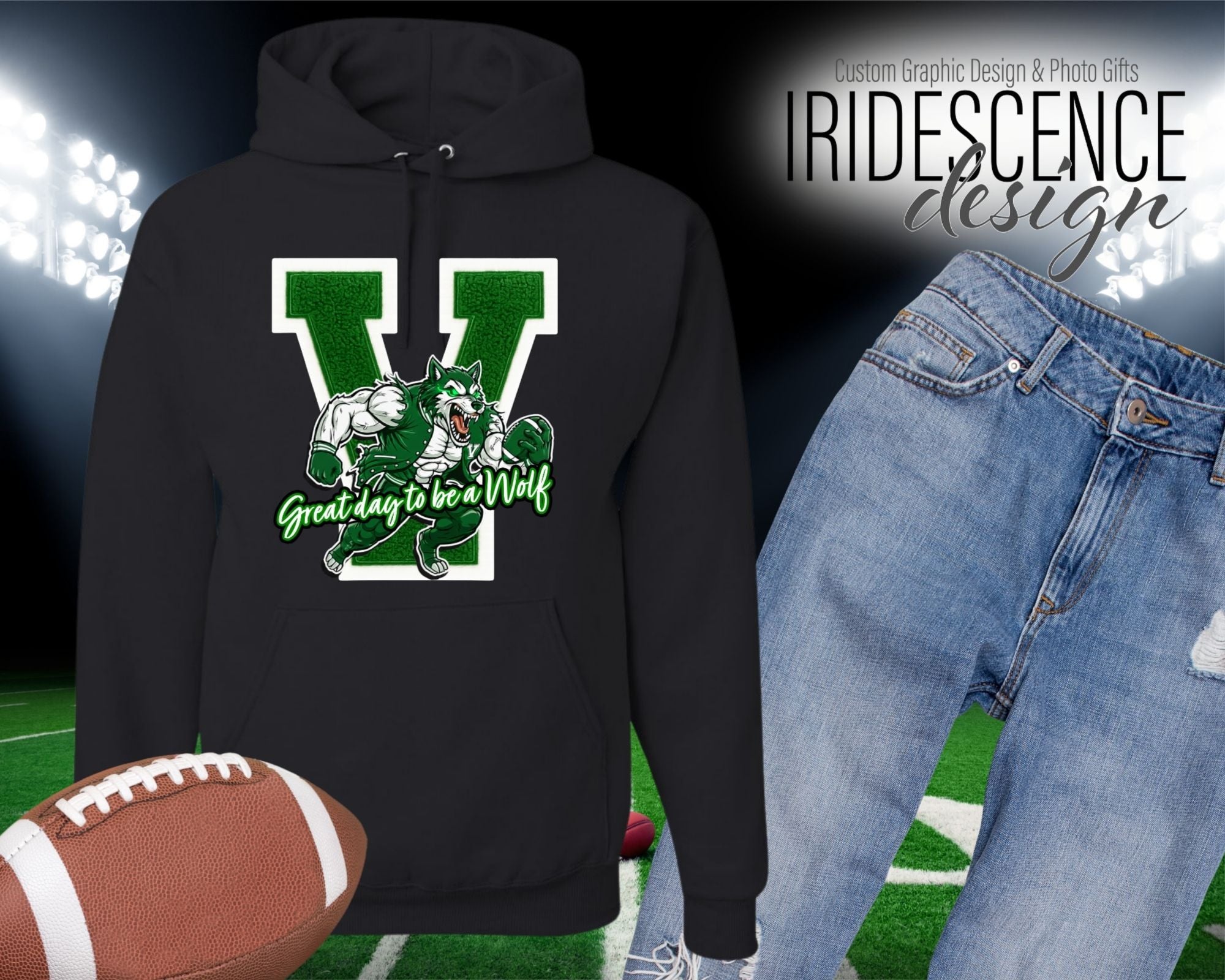 Vigor High School Hoodie - Wording option : The School that Spirit Built or Great day to be a Wolf with a Green Varsity V